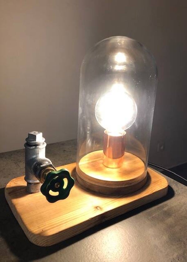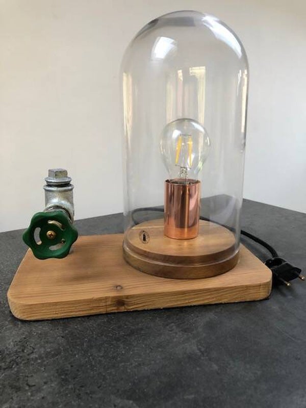 Glass stolp lamp with wood, glass, pipefittiing and water tap control